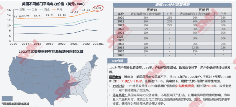作为第二个增长点的户储市场,户储市场的发展和居民本身用电不稳定以及电价高企有着直接的关系。美国居民用电电价常年处于其他各部门电价之首。据SMM了解,美国居民电价从2016年的12.55美分/千瓦时上涨至2023年上半年的15.91美分/千瓦时,涨幅达16.5%。而不仅仅是高电价问题,停电风险在美国也依然存在。据统计,在今年夏天气温飙升时,北美三分之二的地区都面临了能源短缺的风险。部分地区停电时间长达一个月。在这一背景下,分布式光伏+储能刚需性增加。