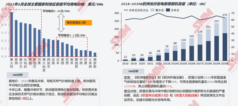 高电价:2022年俄乌冲突,导致天然气价格快速上涨。欧洲居民平均电价达到历史峰值。今年以来,随着冲突环节,欧洲居民用电价暂时回落。但供需关系无法保持天然气价格长期处于低位,欧洲目前居民平均电价仍高出其他地区3倍以上。